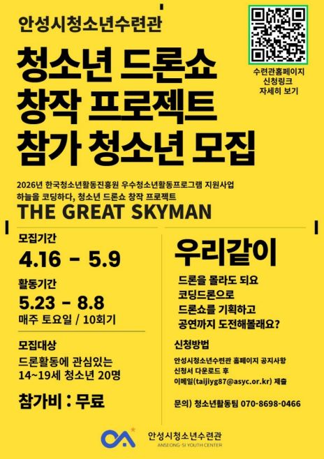 경기호연뉴스 민선기 기자 | 안성시청소년수련관은 미래 디지털 인재 양성을 위한 청소년 참여형 프로그램 '하늘을 코딩하다, 청소년 드론쇼 창작 프로젝트 ‘THE GREAT SKYMAN’'에 참여할 청소년을 4월 16일 ~ 5월 8일까지 모집한다고 밝혔다.
