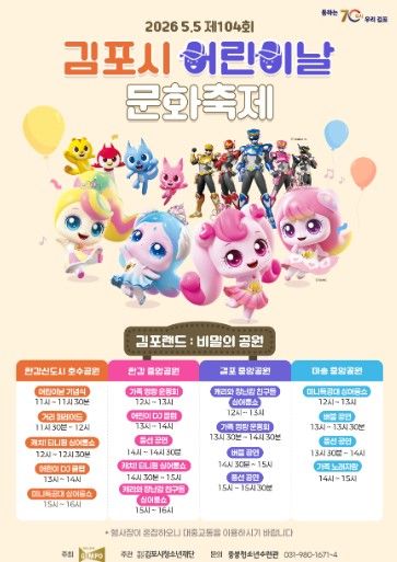 경기호연뉴스 민선기 기자 | 오는 5월 5일, 김포 전역이 하나의 거대한 놀이공원이 된다. 김포시는 시가 주최하고 김포시청소년재단에서 주관하는 제104회 어린이날 문화축제가 한강신도시호수공원(마산동), 한강중앙공원(장기동), 걸포중앙공원(걸포동), 마송중앙공원(통진읍)에서 동시 개최된다고 20일 밝혔다.