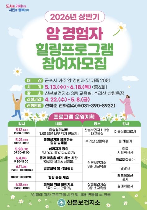 경기호연뉴스 민선기 기자 | 군포시 산본보건지소는 오는 5월 13일부터 6월 18일까지 총 6회에 걸쳐 암 경험자와 그 가족 20여 명을 대상으로 암 경험자 자조모임인 ‘봄·봄·봄 프로그램’을 운영한다.