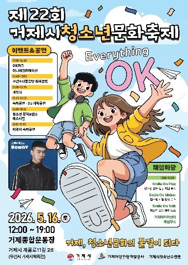 경기호연뉴스 민선기 기자 | 거제시는 오는 2026년 5월 16일 12:00~19:00, 거제종합운동장(우천 시 거제시체육관)에서 제22회 거제시청소년문화축제 “Everything OK”를 개최한다.