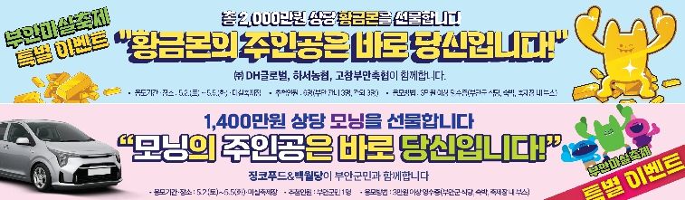 또 (유)징코푸드·피오레, 카페 백월당에서 진행하는 ‘기아 모닝 차량 추첨’ 특별 이벤트는 부안군민 1명에게 당첨의 행운을 안겨다 줄 예정이다.