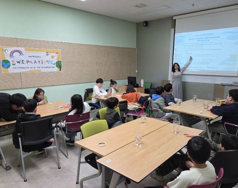 ‘W.E. P-LAY학교(Wake up! English!)’는 영어 회화 능력 향상 및 문화교류를 목적으로 기획된 체험형 프로그램으로, 미공군 가족 자원봉사자와 함께하는 활동 중심 수업으로 구성됐다.