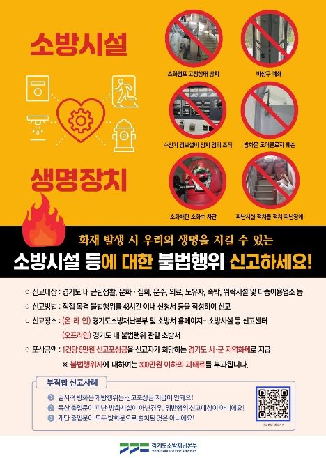 신고는 불법행위 목격 후 48시간 이내 온라인(경기도소방재난본부 및 소방서 홈페이지) 또는 관할 소방서 방문을 통해 가능하다. 인정 시 건당 5만 원의 포상금이 지급되며, 위반자에게는 최대 300만 원 이하의 과태료가 부과된다. 단, 경미한 사례 등 일부는 포상 대상에서 제외된다.