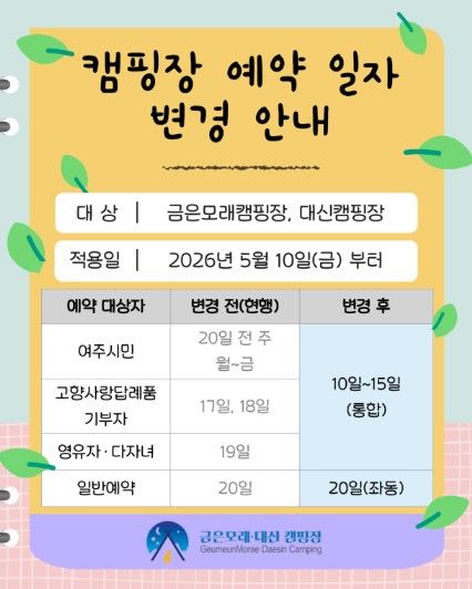 경기호연뉴스 민선기 기자 | 여주도시공사는 오는 5월 10일부터 이용자 중심의 고품질 서비스 제공을 위해 금은모래캠핑장, 대신캠핑장의 온라인 통합예약 일정을 대폭 간소화한다고 밝혔다.