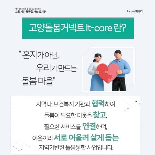 고양돌봄커넥트 It-care 사업은 복합적인 위기에 처한 주민들이 지역사회 안에서 건강하고 독립적인 생활을 유지할 수 있도록 보건과 복지 서비스를 하나로 잇는 통합돌봄 체계를 구축하는 사업이다.