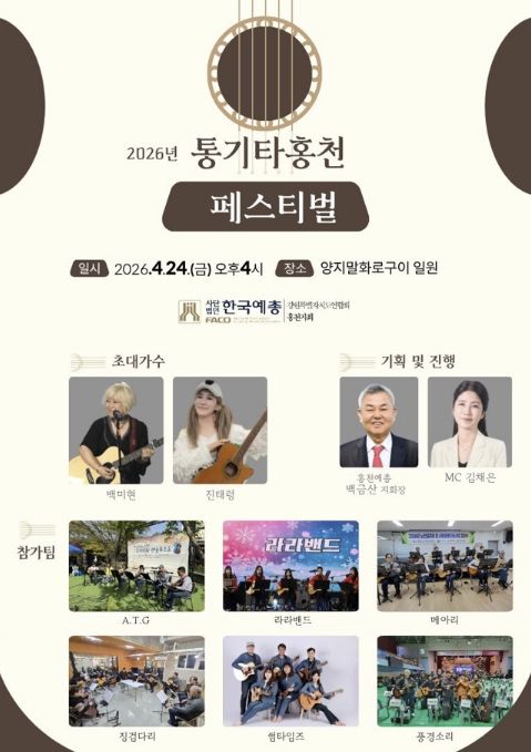 경기호연뉴스 민선기 기자 | (사)한국예총 홍천지회가 주관하는 2026 통기타 홍천 페스티벌이 오는 4월 24일 오후 4시 홍천 양지말화로구이 일원에서 열린다.