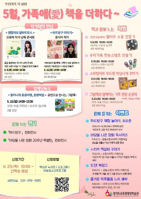 경기호연뉴스 민선기 기자 | 경기도교육청평생학습관이 가족 사랑 실천과 가족 간 유대감 증진을 위해 가족 독서체험 행사인 䃵월, 가족애(愛) 책을 더하다’를 운영한다.