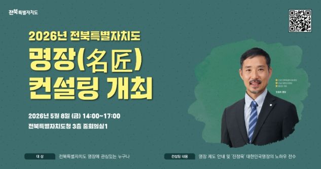 전북명장제도 관련 공고는 전북자치도 누리집에서 확인 가능하며, 컨설팅 참가를 원하는 경우 사전 신청 링크를 통해 등록할 수 있다. 기타 자세한 사항은 전북도청 일자리민생경제과 일자리정책팀으로 문의하면 된다.