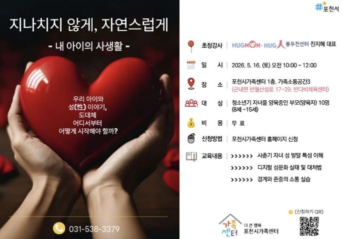 경기호연뉴스 민선기 기자 | 포천시 직영 더 큰 행복 포천시가족센터는 오는 21일부터 사춘기 자녀를 둔 양육자를 대상으로 부모 교육 프로그램 ‘지나치지 않게, 자연스럽게’의 참여자를 모집한다. 이번 교육은 5월 16일 오전, 포천시가족센터 가족소통공간(반다비체육센터 1층)에서 대면 강의로 진행된다.
