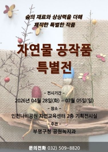 경기호연뉴스 민선기 기자 | 부평구는 부평숲 인천나비공원에서 오는 28일부터 ‘자연물 공작품 특별전’을 개최한다고 밝혔다.