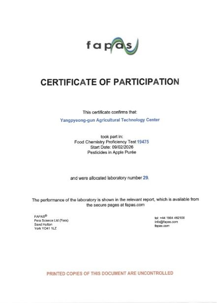 이번 평가는 세계 각국 60개 분석기관을 대상으로 동일한 시료(사과 퓌레)를 배포한 뒤, 각 기관이 2026년 3월 27일까지 제출한 잔류농약 분석 결과를 비교하는 방식으로 진행됐다. 양평군은 11개 농약 성분에 대한 분석 결과를 제출했다.