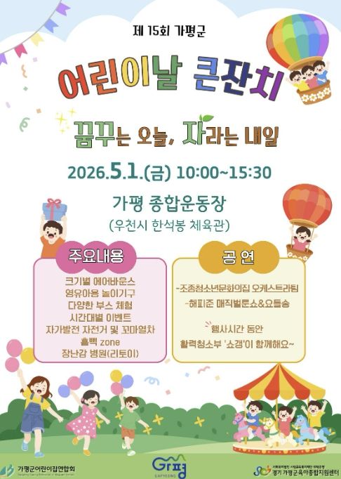 경기호연뉴스 민선기 기자 | 가평군은 오는 5월 1일 오전 10시 가평종합운동장에서 ‘제15회 가평군 어린이날 기념행사’를 개최한다. 가평군어린이집연합회와 가평군육아종합지원센터가 공동 주관하는 이번 축제는 기념행사와 공연, 놀이, 체험 부스 등 다채로운 프로그램으로 꾸며진다.