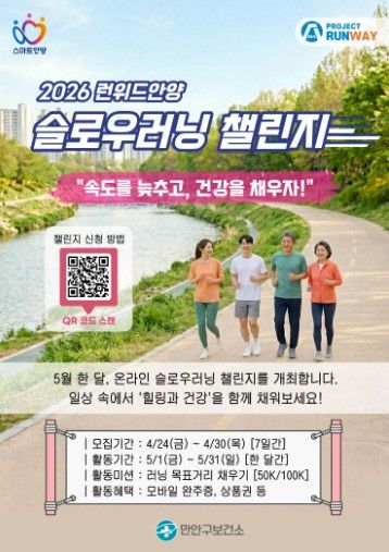 경기호연뉴스 민선기 기자 | 안양시는 시민들의 일상 속 신체활동을 독려하고 건강한 운동 습관 형성을 돕기 위해 오는 5월 한 달간 ‘2026 런위드안양 슬로우러닝 챌린지’를 개최한다고 23일 밝혔다. 참가자 모집은 이달 24일부터 30일까지 진행된다.