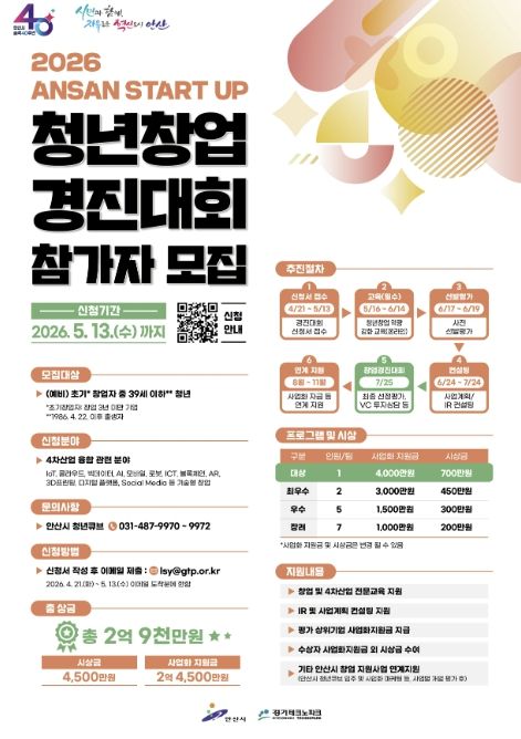 경기호연뉴스 민선기 기자 | 안산시는 창의적인 아이디어를 보유한 청년 창업가를 발굴하기 위해 내달 13일까지 ‘2026 안산 스타트업 청년창업 경진대회’ 참가자를 모집한다고 24일 밝혔다.