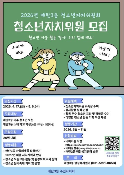 경기호연뉴스 민선기 기자 | 수원시 영통구 매탄3동은 매탄3동 주민자치회가 지역 청소년의 참여를 확대하고, 향후 지역사회를 이끌어 나갈 역량을 기르기 위해 2026년 청소년자치위원회 위원을 모집한다고 밝혔다.