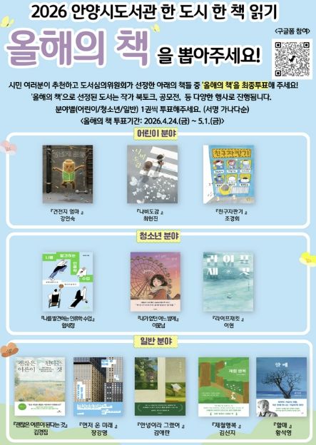 경기호연뉴스 민선기 기자 | 안양시는 2026년 한 도시 한 책 읽기 ‘올해의 책’ 선정을 위한 시민 선호도 조사를 오는 5월 1일까지 온·오프라인으로 진행한다고 24일 밝혔다.