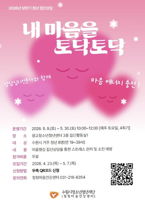 경기호연뉴스 민선기 기자 | 수원시청소년청년재단 청청마음건강센터는 학업과 취업준비, 직장생활 등 경쟁 중심 환경으로 인해 심리적 소진을 겪는 관내 청년들을 대상으로, 오는 5월 7일까지 전문가가 참여하는 집단상담 프로그램 ‘내 마음을 토닥토닥’ 참가자를 모집한다고 밝혔다.