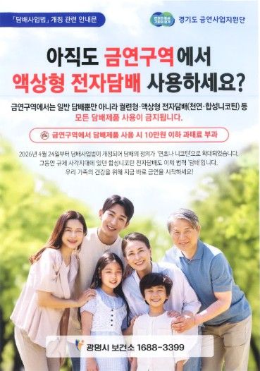 경기호연뉴스 민선기 기자 | 광명시 보건소는 시민 건강을 증진하고 간접흡연 피해를 막기 위해 오는 5월 15일까지 ‘2026년 담배 정의 확대에 따른 금연구역 합동 점검·단속’을 한다.