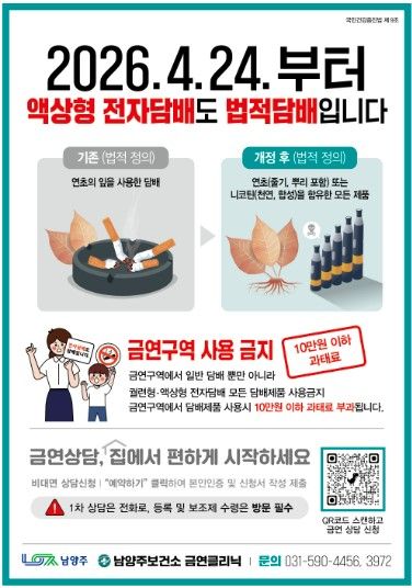 정태식 남양주보건소장은 “액상형 전자담배도 금연구역에서는 일반 담배와 동일하게 단속 대상이 된다”며 “시민 건강 보호와 금연문화 정착을 위해 제도 안내와 금연 지원을 강화하겠다”고 말했다.
