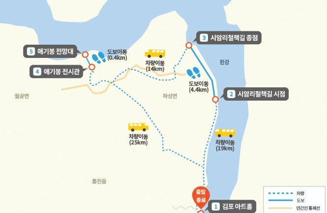 테마노선 김포 코스는 매주 금, 토, 일요일에 운영되며, 김포아트홀(집결지)에서 출발해 시암리 철책길까지 버스로 이동한 뒤 철책길을 따라 약 4.4km 구간을 걷고, 이후 애기봉평화생태공원으로 이동하는 일정으로 구성된다. 전체 소요시간은 약 5시간이다. 참가자는 민통선 내 철책길을 직접 걸으며 접경지역의 생태환경을 체험하고, 애기봉 전망대에서 북한 개풍군 일대의 경관을 조망할 수 있다.