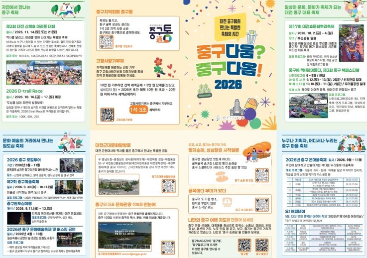 2026년 한 해 동안 열리는 10개 축제는 문화, 예술, 역사, 체육 등 다양한 주제로 채워진다. 대전을 대표하는 ▲대전효문화뿌리축제(10월2일~4일)를 비롯해 ▲중구 원도심야행(9월11일~13일) ▲제3회 중구 북페스티벌(9월12일~13일, 10월10일~11일) ▲제2회 중구 미술축제(9월30~10월12일) ▲D-Trail Race(10월16일~17일) ▲신채호 마라톤(11월 중) 등이 봄부터 늦가을까지 이어질 예정이다.