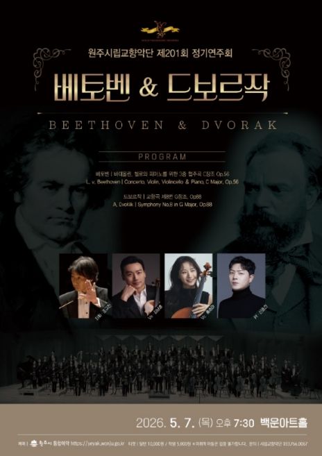 경기호연뉴스 민선기 기자 | 원주시립교향악단 제201회 정기연주회가 오는 5월 7일 오후 7시 30분 백운아트홀에서 개최된다. 이번 연주회에는 지휘자 조규진과 바이올리니스트 김남훈, 첼리스트 홍승아, 피아니스트 신효건이 협연자로 나서 베토벤 3중 협주곡 C장조와 드보르작 교향곡 제8번 G장조를 선보일 예정이다.