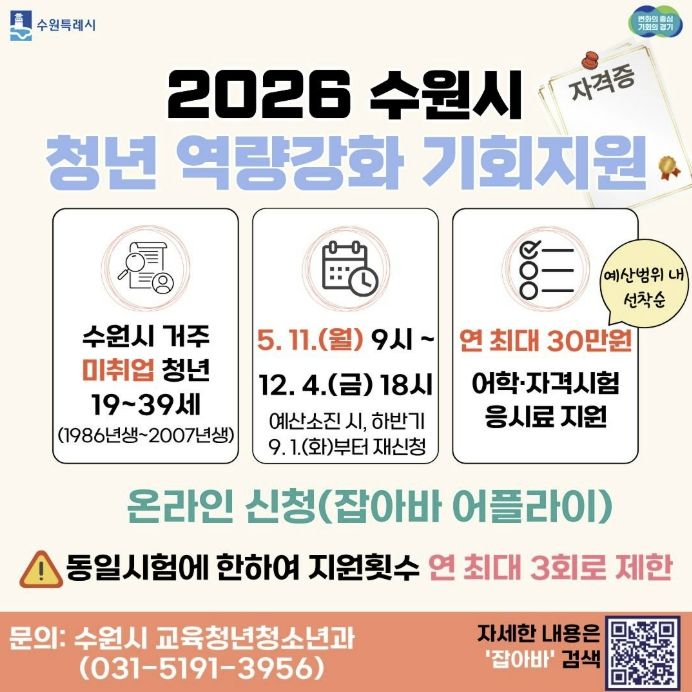 지원 대상은 신청일 기준 수원시에 거주하는 19~39세(1986년생~2007년생) 미취업 청년이다. 2025년 12월 1일 이후 어학·자격시험의 응시자 중 시험 응시일 당시 미취업자인 청년이 신청할 수 있다. 단기간 근로자는 미취업자로 인정한다.