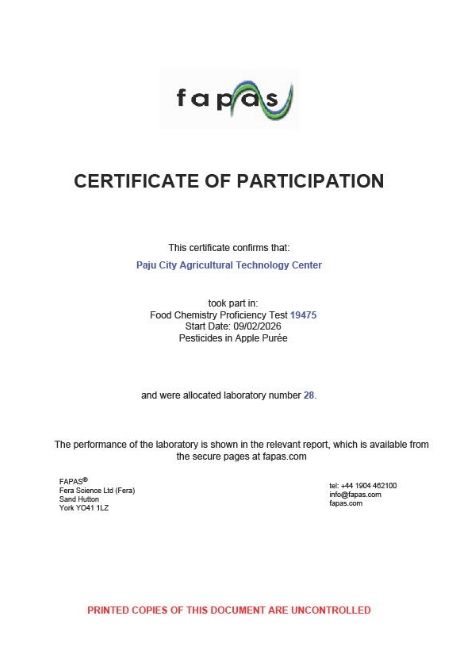 영국 환경식품농림부 식품환경연구청(페라·FERA)이 주관하는 ‘국제분석능력평가’(파파스·FAPAS)는 전 세계 공인 분석기관들이 동일한 시료를 분석해 그 정확도를 상호 비교하는 권위 있는 평가 프로그램이다. 전 세계 60개 기관이 참여한 올해 평가(파파스 19475) 결과, 파주시 농산물 안전분석실은 사과 과립즙(퓨레) 시료에 대해 10개 잔류농약 성분을 분석해 제출한 전 항목에서 ‘만족’판정을 획득했다.