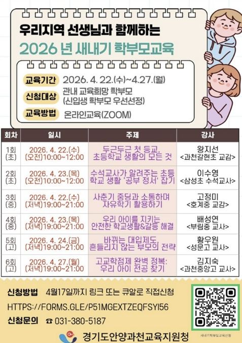 안양과천교육지원청 관계자는 “현직 선생님들의 전문적인 가이드를 통해 학부모들이 자녀의 학교생활을 깊이 이해하고, 가정 내 교육 역량을 강화하는 소중한 시간이 되길 바란다”고 전했다.