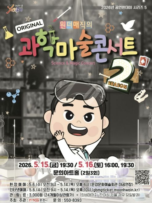 경기호연뉴스 민선기 기자 | 문경문화예술회관에서는 5월 어린이 달을 맞아 마술과 과학의 경계를 넘나들며 온가족 모두가 재미있게 관람할 수 있는 과학마술콘서트 시즌2 공연을 5월 15일 19:30, 16 16:00, 19:30 (2일 3회)에 문희아트홀에서 개최한다.