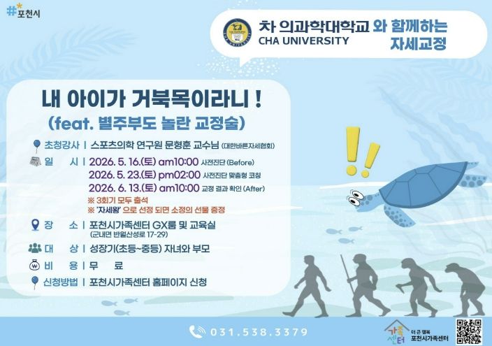 최선희 포천시가족센터장은 “이번 프로그램은 부모와 자녀가 함께 자녀의 자세 상태를 이해하고, 가정에서 건강한 생활습관을 실천하는 데 의미가 있다”며 “앞으로도 지역 대학과 협력해 전문성을 갖춘 가족 중심 건강지원 프로그램을 확대해 나가겠다”고 말했다.