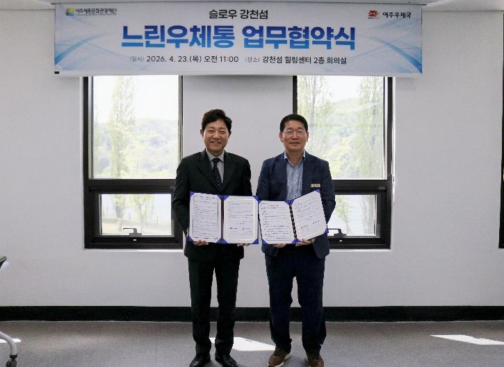 경기호연뉴스 민선기 기자 | 여주세종문화관광재단과 여주우체국은 4월 23일 강천섬 힐링센터에서 ‘슬로우 강천섬 느린우체통 업무협약(MOU)’을 체결했다. 빠르게 흘러가는 일상 속에서 잠시 걸음을 멈추고, 소중한 사람에게 미래의 마음을 전할 수 있는 감성 관광콘텐츠를 공동으로 운영하기 위해서다.