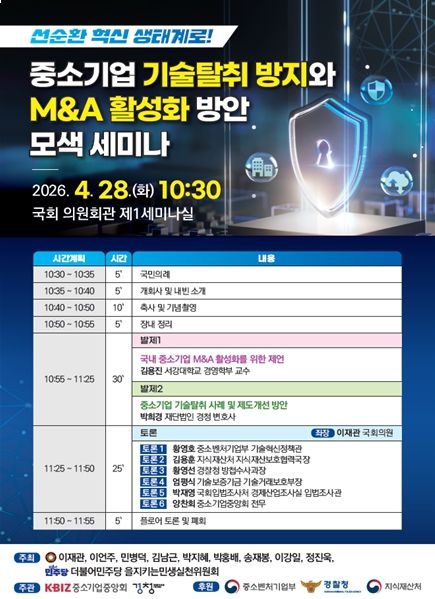 경기호연뉴스 민선기 기자 | 이재관 의원(충남 천안을·더불어민주당)이 오는 28일 오전 10시30분 국회 의원회관 제1세미나실에서 ‘선순환 혁신 생태계로! 중소기업 기술탈취 방지와 M&A 활성화 방안 모색 세미나’를 개최한다고 밝혔다.