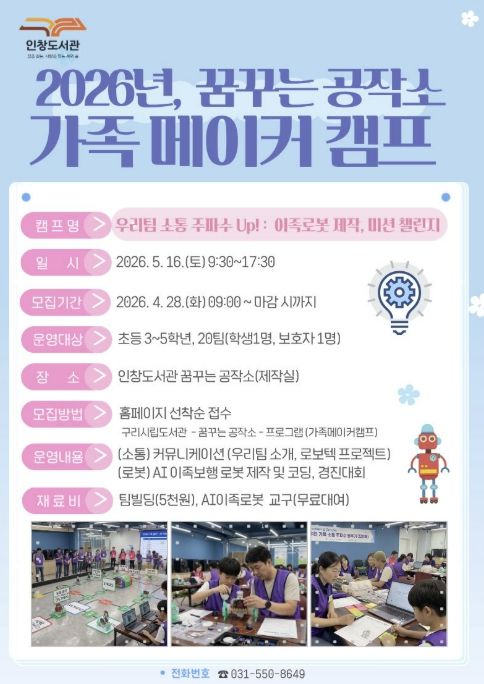 경기호연뉴스 민선기 기자 | 구리시 인창도서관‘꿈꾸는 공작소’는 오는 5월 16일 초등학생 자녀와 보호자가 함께 참여해 가족 간 유대감을 높이고 인공지능을 체험하는 '우리 팀 소통 주파수 Up! : 이족로봇 제작, 미션 챌린지' 가족 메이커 캠프를 운영한다고 밝혔다.