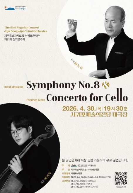 경기호연뉴스 민선기 기자 | 서귀포시는 4월 30일 19시 30분 서귀포예술의전당 대극장에서 ‘제주특별자치도립 서귀포관악단 제91회 정기연주회’를 개최한다.