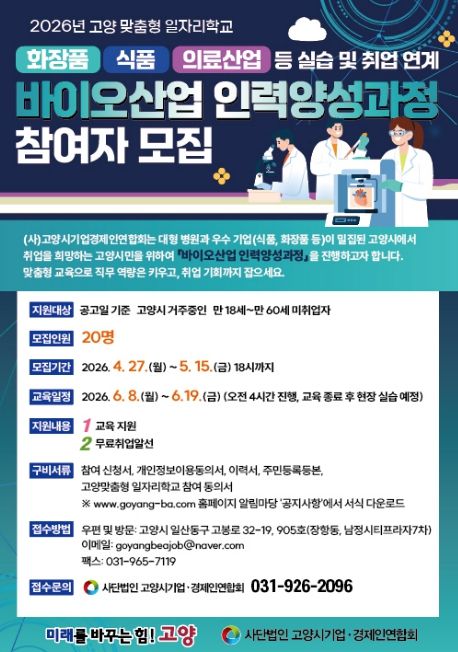 경기호연뉴스 민선기 기자 | 고양특례시는 2026년 고양맞춤형 일자리학교 공모사업 중 ‘바이오산업 인력 양성과정’의 참여자를 모집한다.