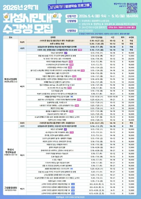 경기호연뉴스 민선기 기자 | 화성특례시는 2026년 화성시민대학 2학기 수강생을 오는 5월 4일부터 5월 10일까지 선착순으로 모집한다고 밝혔다.