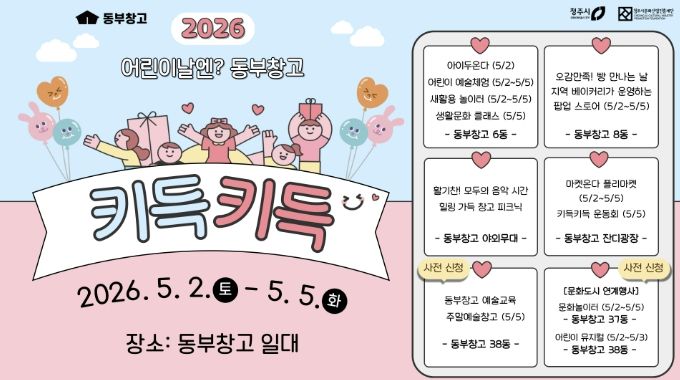 경기호연뉴스 민선기 기자 | 청주시와 청주시문화산업진흥재단은 가정의 달 5월을 맞아 오는 5월 2일부터 5일까지 동부창고 일원에서 어린이날 행사 ‘키득키득’을 연다.
