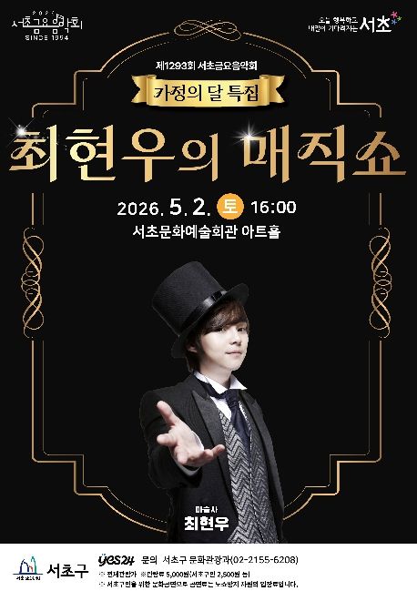 경기호연뉴스 민선기 기자 | 서울 서초구가 가정의 달 5월을 맞아 오는 5월 2일 토요일 오후 4시, 서초문화예술회관 아트홀에서 서초토요콘서트 '최현우의 매직쇼'를 개최한다고 밝혔다.