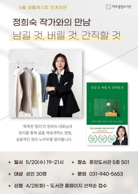 경기호연뉴스 민선기 기자 | 파주시 중앙도서관은 오는 5월 20일 19시, 정리 전문가 정희숙 작가를 초청한 '남길 것, 버릴 것, 간직할 것' 강연을 개최한다.