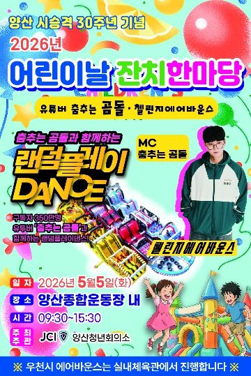한편, 웅상지역에서도 5월 5일 오전 10시부터 웅상센트럴파크에서 '어린이날 가족한마당' 행사가 열리며, 유튜버공연 및 마술공연 등 다양한 축하공연과 가족레크레이션 및 체험부스 운영이 진행될 예정이다.