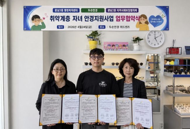 경기호연뉴스 민선기 기자 | 광주시 광남2동 행정복지센터와 지역사회보장협의체는 지역 안경업체 두 손 안경 위드렌즈와 함께 취약계층 아동·청소년의 시력 보호와 학습환경 개선을 위한 안경 지원사업 업무협약을 체결했다고 28일 밝혔다.