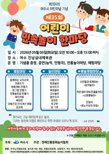 경기호연뉴스 민선기 기자 | 여수시는 제104회 어린이날을 맞아 5월 5일, 아이들이 가족과 함께 전통문화를 즐기며 마음껏 뛰놀 수 있는 민속놀이 놀이 한마당을 개최한다.