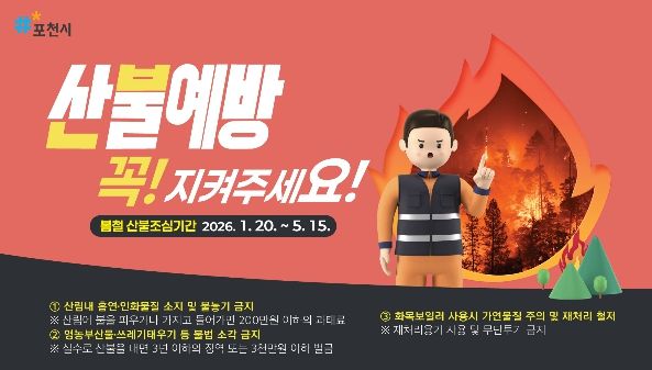 포천시는 시민들에게 영농부산물·쓰레기 불법 소각 금지, 산행 시 라이터·버너 등 화기 소지 및 흡연 금지, 입산통제구역과 등산로 폐쇄 구간 출입 금지 등 산불예방 수칙 준수를 당부했다.
