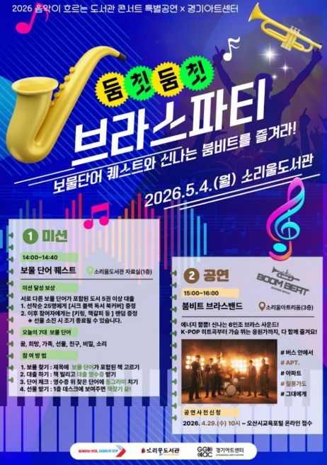 경기호연뉴스 민선기 기자 | 오산시 소리울도서관은 제104회 어린이날을 앞둔 오는 5월 4일 경기아트센터와 협업해 ‘2026 음악이 흐르는 도서관 콘서트’ 특별공연인 ‘둠칫둠칫 브라스 파티’를 개최한다고 밝혔다.