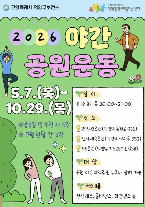 덕양구보건소 관계자는“지역 주민들의 건강 증진을 위해 신체활동 사업을 지속 확대하겠다”라며 “2026년에도 운영되는 야간공원 운동에 지역주민의 많은 관심과 적극적인 참여를 부탁드린다”라고 밝혔다.