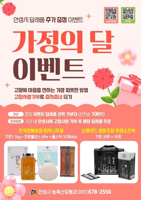 경기호연뉴스 민선기 기자 | 안성시는 오이데이와 5월 가정의 달을 맞아 고향사랑기부제 참여 확대와 지역 농산물 소비 촉진을 위해 ‘오이데이 이벤트’와 ‘가정의 달 이벤트’를 추진한다고 밝혔다.