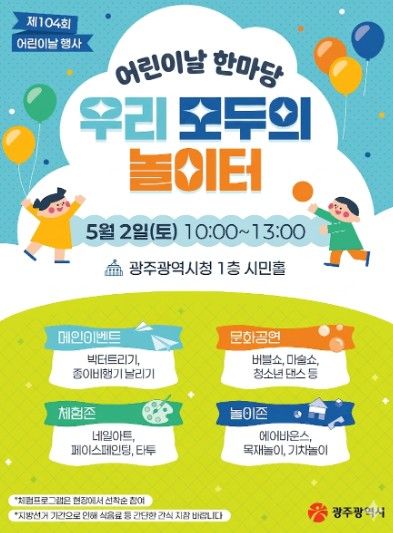 경기호연뉴스 민선기 기자 | 광주광역시는 어린이날을 기념해 오는 5월 2일 오전 10시부터 오후 1시까지 시청 1층 시민홀에서 특별행사를 연다.
