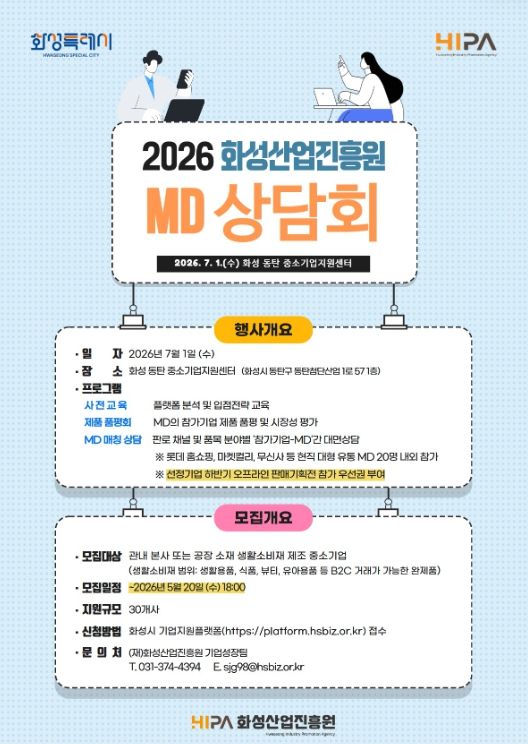 경기호연뉴스 민선기 기자 | 화성산업진흥원(원장 전병선)은 화성시 생활소비재 기업의 대형 유통망 진입과 신규 판매채널 확보를 지원하기 위해 ‘2026년 화성산업진흥원 MD 상담회’를 개최하고, 오는 5월 20일까지 참여기업을 모집한다.