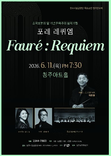 경기호연뉴스 민선기 기자 | 청주시립합창단은 6월 11일 오후 7시 30분 청주아트홀에서 호국보훈의 달 기념 민족주의 음악여행 ‘포레 레퀴엠’을 선보인다고 29일 밝혔다.